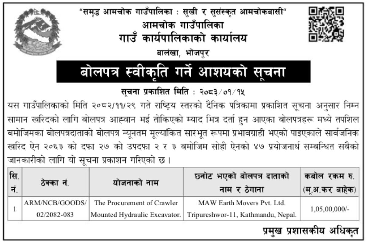 बोलपत्र स्वीकृति गर्ने आशयको सूचना।